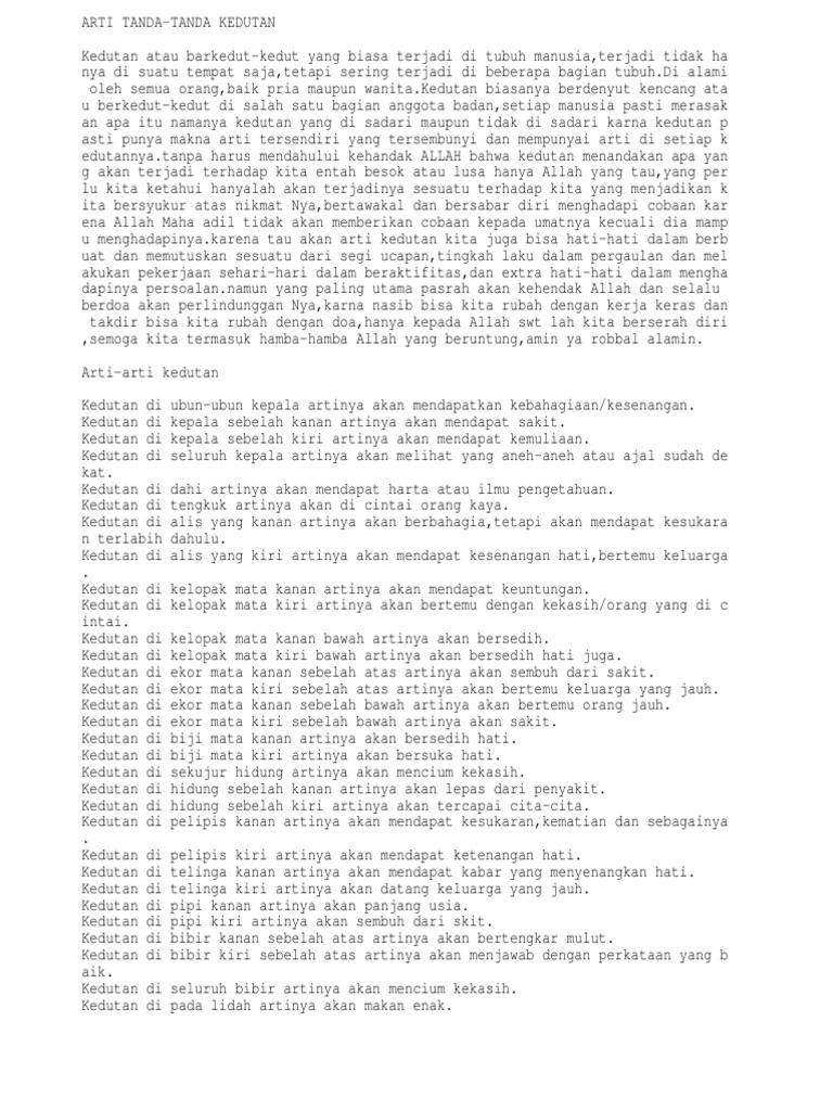 Apa arti kedutan kelopak mata kiri atas menurut primbon jawa, dan bagaimana pejelasannya menurut islam? 5 arti kedutan betis kiri menurut kitab mujarobat islam dan primbon jawaподробнее. Konon katanya, segala yang terjadi pada tubuh kita bisa menjadi sebuah pertanda, yang nantinya akan membawa dampak di masa yang akan datang. Kedutan di pipi kanan : Kelopak mata yang terasa tertarik sendiri atau dikenal dengan istilah kedutan mungkin pernah dialami semua orang. Saya kemudian membuka primbon peninggalan kakek buyut saya yg masih ditulis nah, demikianlah pemaparan sekilas yang bisa aku sampaikan tentang pengalaman pertanda ramalan arti kedutan betis kanan dan kiri. Kedutan juga ada yang menafsirkan merupakan sebuah isyarah atau pertanda akan terjadi sesuatu, kepercayaan dan pernyataan yang demikian memang sulit di pungkiri, mengingat masih begitu banyak masyarakat indonesia yang masih sangat erat memegang kepercayaan dari para leluhurnya. Kedutan arti firasat mata kiri atas kanan bawah alamat makna tanda lengan sebelah kelopak bibir alis primbon kenapa di lutut terus menerus sering betis belikat bokong tandanya perut tubuh menurut tengah telapak tangan bahu kesehatan hidung. Bagian kepala sebelah kanan betis kanan : Menurut primbon jawa, arti kedutan mata pada bagian alis kiri maka pertanda baik. Selanjutnya arti dari kedutan di betis kiri akan penulis jelaskan dibawah ini dan sudah pasti merujuk menurut buku primbon yang berhasil penulis rangkum secara detail hanya khusus untuk sobat cendol dawet. Akan dihasut oleh orang 86. Kedutan pergelangan kaki kanan :